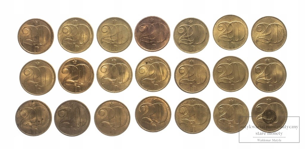 Czechosłowacja, zestaw monet obiegowych, 20 halerzy z lat 1972-1992 (21 sztuk)