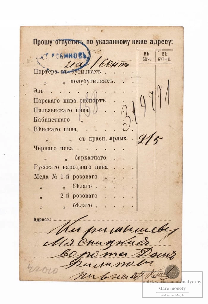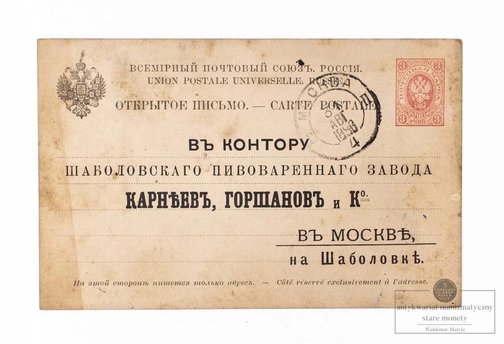 STARA POCZTÓWKA BROWARU SZABOŁOWSKIEGO „Karnejew, Gorszanow i S-ka”, MOSKWA 1888