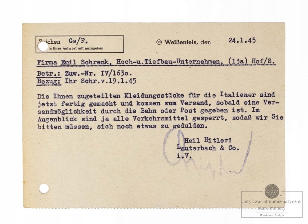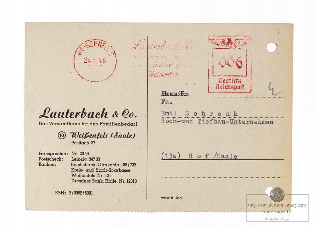 STARA POCZTÓWKA / LIST - WEISSENFELS, LAUTERBACH & CO / HOF 1945